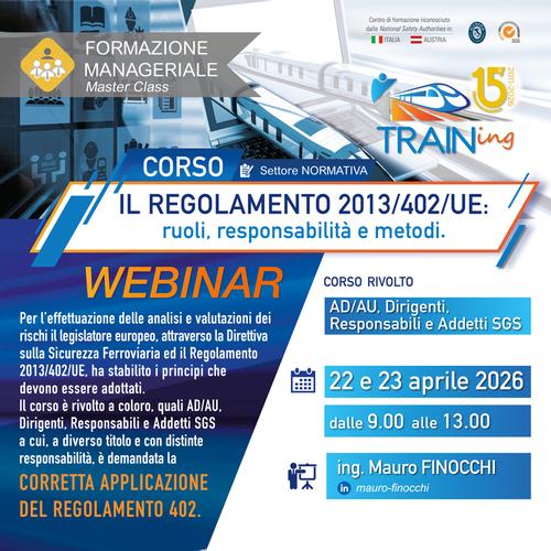 Für die Evaluierung und Bewertung von Risiken hat der europäische Gesetzgeber mit der Richtlinie über die Eisenbahnsicherheit und der Durchführungsverordnung (EU) Nr. 402/2013 die zu befolgenden Grundsätze festgelegt. Die Ausbildung richtet sich an Geschäftsführer/innen, Führungskräfte und SMS-Verantwortliche, die mit der ordnungsgemäßen Anwendung der EU-Verordnung Nr. 402/2013 betraut sind und bei eventuellen Änderungen besagter Regeln, deren Auswirkungen bewerten und entsprechende Maßnahmen erarbeiten und einleiten müssen.